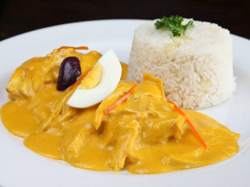 Clásico plato peruano con trozos de pollo en cremosa salsa de ají amarillo y pan remojado en leche, acompañado de papas nativas y arroz