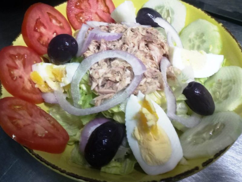 Vegetales frescos con atún, huevo, alcaparras,cebolla y aceitunas, con aroma y sabor mediterráneo, acompañado de aceite de oliva y vinagre.