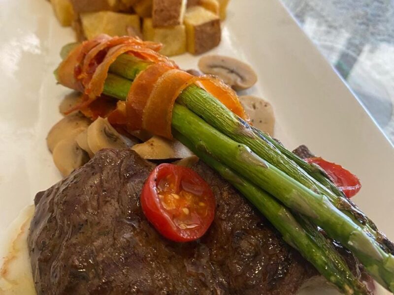 Exquisito corte de lomo fino con tocino a la parrilla y salsa cremosa de champiñones, acompañado de papas fritas y vegetales cocidos.