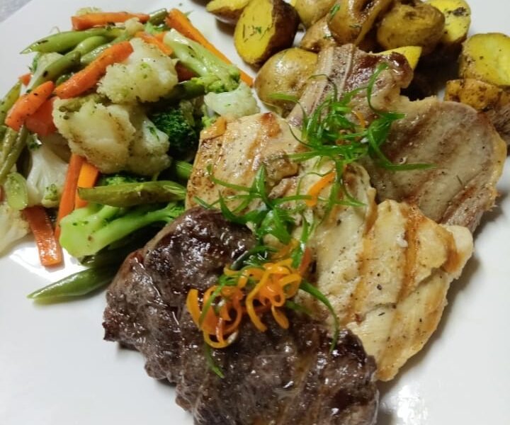 Exquisita combinación de tres carnes a la parrilla; lomo fino, cerdo y pollo, acompañado de papas fritas y ensalada mixta.