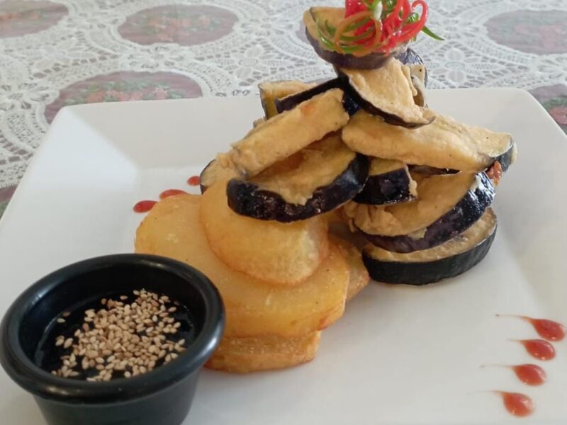 Berenjenas en láminas crocantes, acompañado de papas doradas y deliciosa salsa teriyaki.