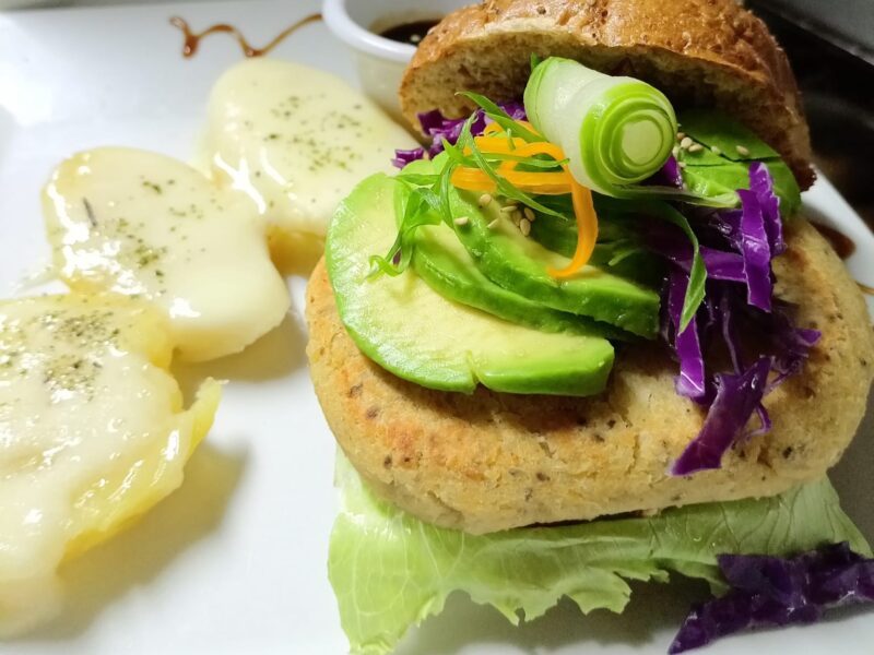 Versión vegetariana de hamburguesa con palta y papas grilladas con queso derretido.