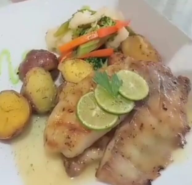 Filete de pescado a la parrilla bañado en suave salsa con aroma de limón, perejil y ajo. Acompañado de papas nativas y vegetales cocidos.