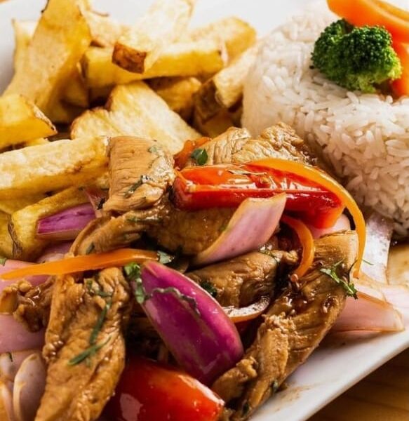 Jugosa carne de res con cebolla, tomate en aroma de culantro y ají amarillo, hechos al wok y acompañado de papas fritas y arroz.